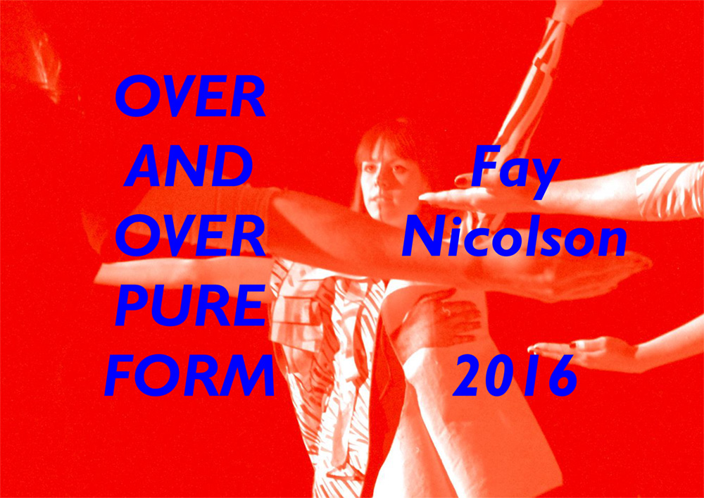 OVER AND OVER PURE FORM is a long form poem activated by gesture and performed to a drum track. The poem describes the curriculum of a phantasy Art School, pasting Modernist studio exercises and Post-Modern reflexivity onto a neurotic atmosphere of contemporary neo-liberal demands. In OVER AND OVER PURE FORM I use prosody, melodrama, humour, and gestural motifs to wrest communication from the literal and rational towards the surreal, associative and sensual. The narrator is a visionary yet sadistic tutor, instructing students into impossible formal and ideological positions. A chorus of willing students take on the forms of the contradictory pedagogical approaches they are subjected to, awkwardly marching to the beat whilst craving for moments of realization, rupture, and resistance.